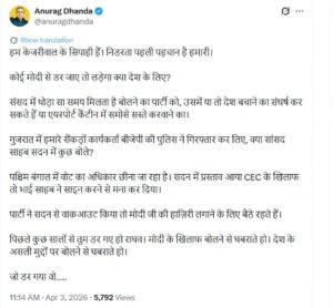 अनुराग ढांडा ने दावा किया कि गुजरात में AAP के सैकड़ों कार्यकर्ताओं को बीजेपी सरकार और पुलिस ने गिरफ्तार किया। लेकिन इस मुद्दे पर राघव चड्ढा ने संसद में आवाज नहीं उठाई।
