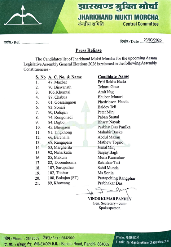 Ranchi : झारखंड मुक्ति मोर्चा (JMM) ने असम विधानसभा चुनाव 2026 के लिए अपने उम्मीदवारों की पहली सूची जारी कर दी है। पार्टी ने कुल 21 सीटों पर प्रत्याशियों के नाम घोषित किए हैं। पार्टी की ओर से जारी सूची में कई नए चेहरों को मौका दिया गया है, वहीं कुछ अनुभवी नेताओं पर भी भरोसा जताया गया है। JMM ने इस बार स्थानीय और जमीनी स्तर पर मजबूत पकड़ रखने वाले उम्मीदवारों को प्राथमिकता दी है।